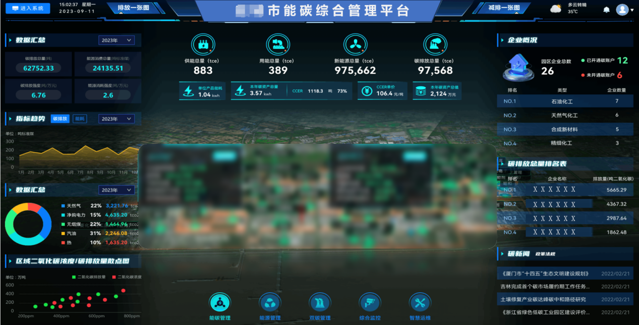 某城市能碳综合管理平台,通过建立能碳双重管理体系,能源领域开展综合能耗监测、能耗分析管理、绿色清洁能源应用管理,助力开展绿证交易服务等一系列服务,同步搭建了双碳服务的9碳服务能力体系建设,通过双碳的碳咨询、碳监测、碳核算,碳核验、碳足迹支持,推进各类组织的碳披露,碳市场交易,建设碳金融与绿色投融资保障机制,最终推进完成碳治理的工作,能碳融合,在既有双碳能力体系建设能力基础之上,升级为“能+碳”综合管理平台,高效解决了能碳产业缺乏指导、缺乏方向,缺乏工具与实现路径的一揽子问题,助力地方提升双碳背景下的综合竞争力。